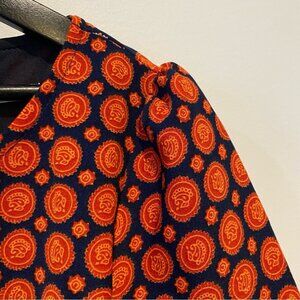 Gorgeous burnt orange and navy Morrocan Middle Eastern Mediterranean print on a long sleeve polyester dress with back zip and slight pleats in the skirt and puffy shoulders