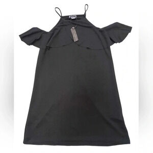 Little black dress. Sleeveless with cold shoulders, this mini has stretch available. Cute ruffling on the shoulders, new with tags. I accidentally washed this item, that is why the tag looks a bit distressed 😅