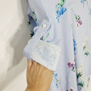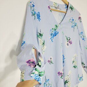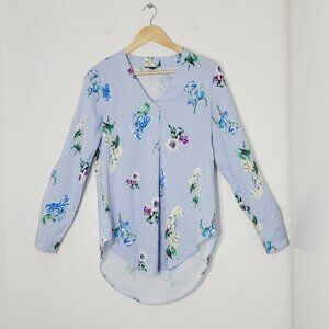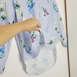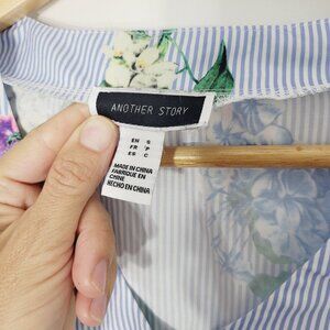 Another Story Women's Blue White Stripe Floral Print V-Neck High Low Blouse Small