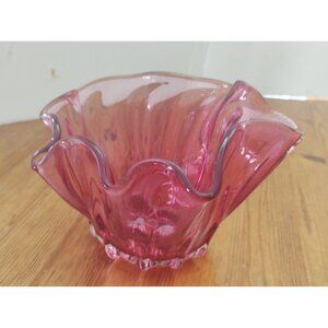 Anthony Rossi Hand Blown Glass Fluted Edge Cranberry Bowl 6" x 6" x 4.5"