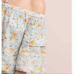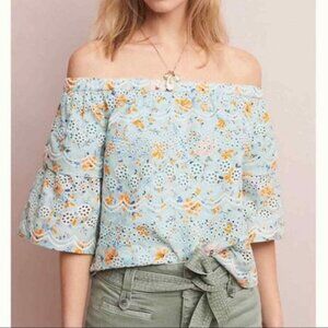 Anthropologie Laia aqua-coloured eyelet off-the-shoulder top. Embroidered throughout with a peach/pink/blue floral design and elasticized band across the top for stretch & comfort. Fully lined (lightweight cotton). Fabric is listed as 100% cotton. Size small, 18" armpit to armpit. BNWT, perfect condition, never worn from a smoke and pet-free home.