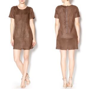 Faux suede brown stretch short sleeve dress with exposed back zipper, extremely comfortable! Wear this dress with leather boots to go with the suede.