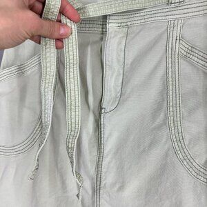 Tie waist, front zipper, 2 big front pockets & 2 back pockets. This washed chino fabric also has stretch to it.