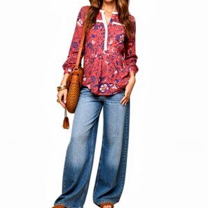 dRA Los Angelos White Polka Dot Floral Blouse. Flowy & boho shirt with open, v-neck.