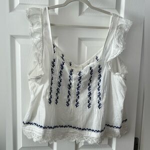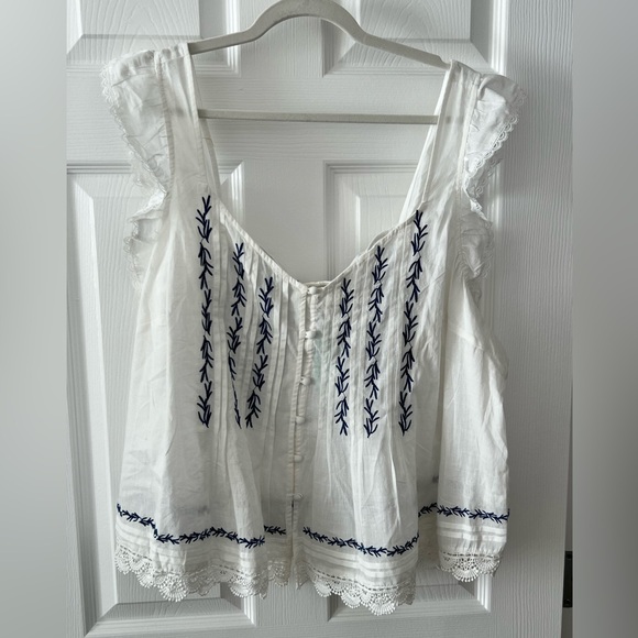Brand new with tags, Maeve by Anthropologie flutter sleeve pintuck button-down shirt. White with blue embroidery. Cotton voile material. Lace trim. Fits more flowy and oversized.