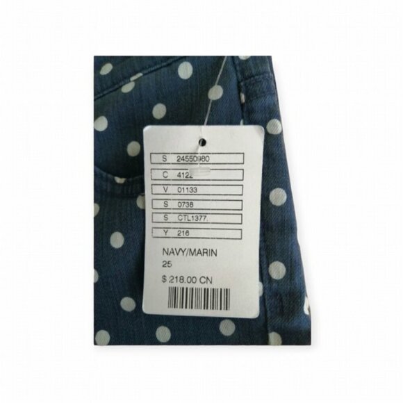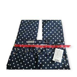 New with tags, AG Stevie Ankle jeans offer a flattering slim straight fit with a stylish navy and white polka dot print.