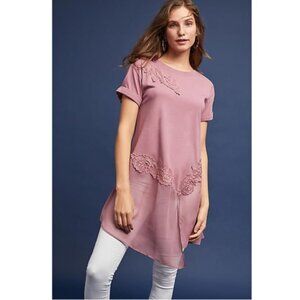 Anthropologies Akemi + Kris lace tunic top in very good pre-owned condition. 100% cotton. Dusty rose. Features lace appliqué on the top right and along the bottom. Sheer fabric on the bottom allows for this shirt to look great layered over pants.