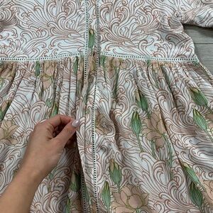 Short sleeve relaxed fit, flowy tunic with contrasting trim. All over floral print in cream, peach - y tan, and sage green. Button front.