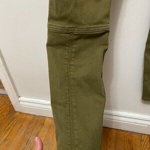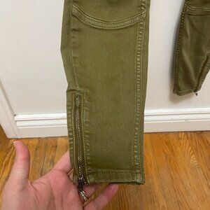 Tags: Anthropologie, pants, trousers, leggings, army green, moto, zip pants, high-rise, denim leggings, jeggings, skinny fit, petite, size 26, women's, zipper, stretch denim, pockets, fall fashion, casual, streetwear, utility style, olive green, workwear