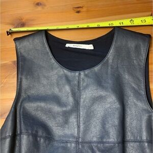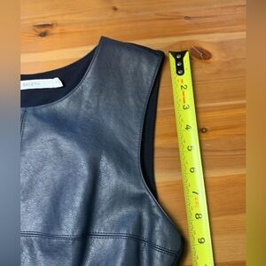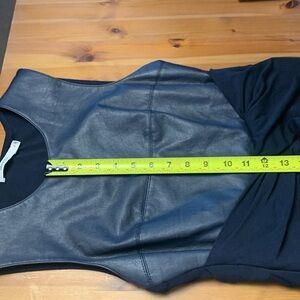 This attractive dress has quite an interesting construction. They started with a navy sheath dress and then added the faux front and the gathering around the waistband. The result is a stunning dress that has a defined waist at both the front and back and a faux leather upper front.