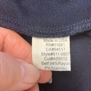 This attractive dress has quite an interesting construction. They started with a navy sheath dress and then added the faux front and the gathering around the waistband. The result is a stunning dress that has a defined waist at both the front and back and a faux leather upper front.