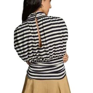 Chic striped top with short sleeves. High neckline. Perfect for casual wear.