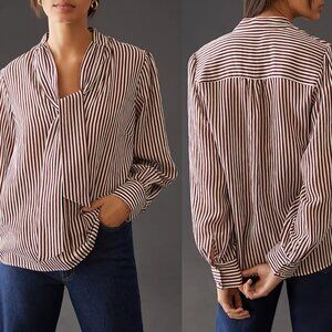 This maroon and white stripe blouse is a part of the Maeve Collection, where each design represents both beauty and strength. So it’s no surprise that Markle chose this empowering blouse for her debut podcast. On top of that, she has also been known to be a massive fan of stripe shirts. Markle simply left the pullover blouse tucked in with the tie loose during the video. However, the bow accent is the key feature that can be styled in a variety of ways for a vintage feminine fit.