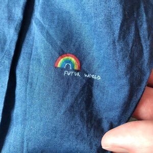 Stylish blue button down shirt with subtle rainbow accents. Perfect for casual outings.