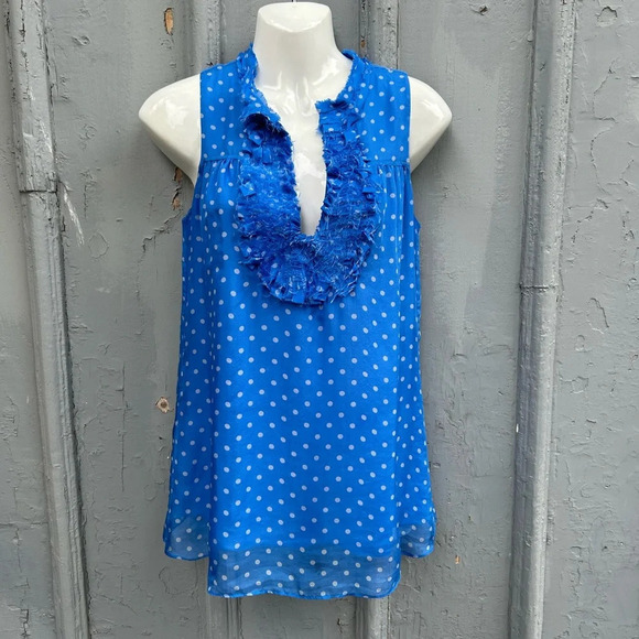 Polka dots and silk, pretty blue polka dot sleeveless blouse with neckline detailing. Materials tag has been cut but online I’ve found details that it is silk with poly lining.