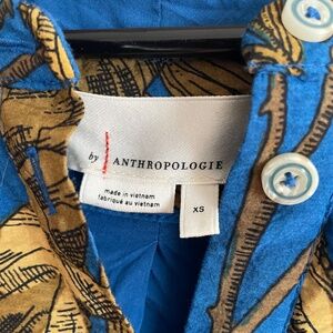 Chic blue dress with gold floral pattern. Features button-up front and ruffled sleeves. Perfect for casual outings.