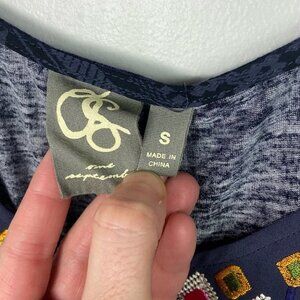 Anthropologie One September Barranco Embroidered Tunic Top in Women's Size Small. Woven poly front and rayon knit back. Front elastic detail. Pullover styling. Machine washable. Very good pre-loved condition. No visible flaws.