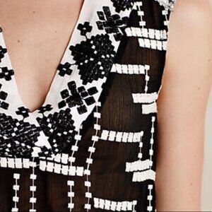 Anthropologie Tiny Chapparal Tunic in Women's Size XS. Beautiful black and white sheer print. V-neck. Sleeveless. Poly / tencel/ modal / spandex. Hand wash cold. Very good pre-loved condition. No visible flaws.