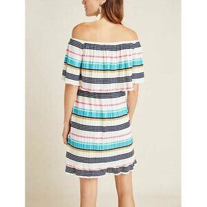 Anthropologie Boho Off the Shoulder Mini Dress XL White Striped A-Line Pleated