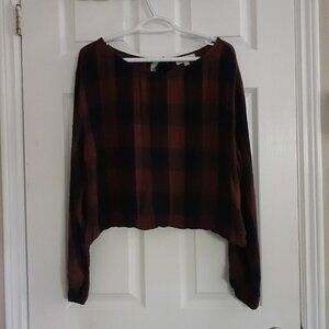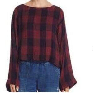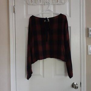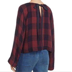 Anthropologie Cloth & Stone Women's M Wine & Blue Plaid Tie Back Cropped Blouse