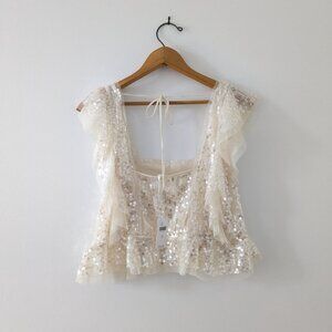Elegant cream blouse with shimmering sequins. Features ruffled sleeves and tie-back detail. Perfect for special occasions.
