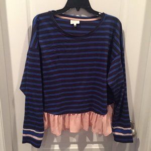 BNWOT Deletta Ruffled Rugby Pullover from Anthropologie. Cotton blue stripes with pink chiffon ruffle detail.