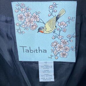 Anthropologie Tabitha Tomasina Drapey Silk Black Blazer in Women's Size 12. Shell is 100% lyocell and contrast is 100% silk. Lined. Front hood and loop closure. Waterfall front that can be worn open or clasped. Excellent pre-loved condition. No visible flaws. Perfect go-to capsule wardrobe blazer that can be dressed up or dressed down and adds some style flare. Retails for $128 USD (approximately $178 CAD).