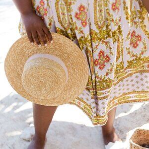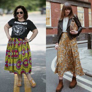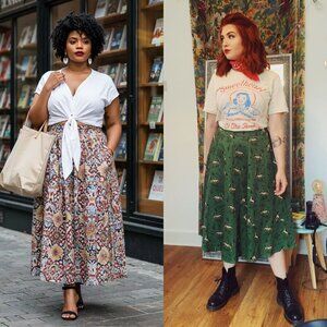 This bold, scarf-printed skirt from Anthropologie features a flattering A-line silhouette, back zip, pockets and elegant pleating. The ornate golden details against the lavender background give a classic, retro look. This high-quality piece drapes beautifully and is fully-lined as well (100% viscose shell, 100% rayon lining). A skirt like this is amazingly versatile for warmer or cooler weather — pair it with strappy sandals, tied-up tees, blouses or chunky booties!