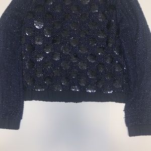 VGUC Elevenses dark blue zip-up jacket from Anthropologie with sequin embellishments, sparkly tweed sleeves, and elasticized cuffs and waistband in women’s size extra small (XS).