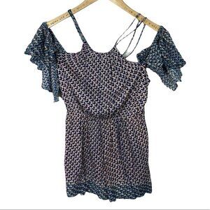 Anthropologie Elevenses Madalenna Open Shoulder Romper in Women's Size XS. 100% rayon. Pull-on styling. Flutter sleeve detail, elasticized along the upper edge. Spaghetti straps that criss cross in the back. Elasticized along the top edge of back bodice and waist. Retails for $98 USD (approximately $136 CAD). Very good pre-loved condition. No visible flaws.