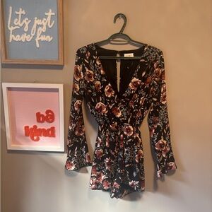 Stylish jumpsuit with floral pattern. Features a wrap design and V-neck. Ideal for versatile wear.