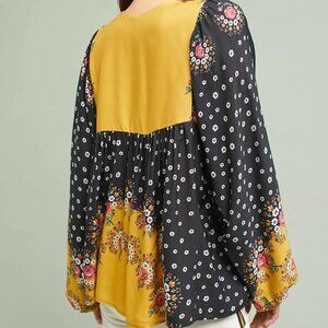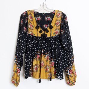 Anthropologie Farm Rio Intarsia Boho Floral Peasant Blouse Black Yellow Small