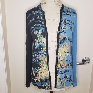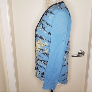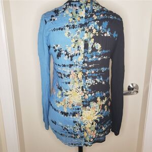 Contrast light & navy Blue long sleeve collarless vneck buttonup Blouse with lovely mirrored Floral print, by LIE (former Anthropologie brand).