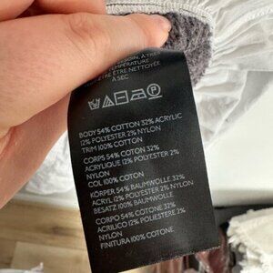 Cozy gray sweater with button front. Features a stylish white hem. Perfect for layering.