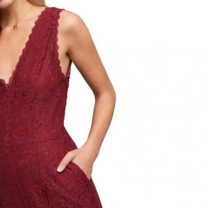 This chic black lace jumpsuit by Greylin, offered through Anthropologie, features a sleeveless design with a V-neckline, cropped wide-leg silhouette, and convenient side slant pockets. Made from a high-quality blend of nylon, cotton, and lined with a soft polyester-spandex fabric, it provides a comfortable yet stylish fit. The back zip ensures easy wear, while the cuprammonium rayon pocket lining adds a luxurious touch. Perfect for evening wear, this Size XS jumpsuit is a timeless, statement piece for any wardrobe. Please note: stock photos in red are for fit reference; the actual item is black. #Greylin #Anthropologie #LaceJumpsuit #EveningWear #TimelessFashion