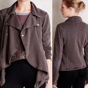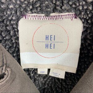 Anthropologie Hei Hei Laena Moto Jacket in Grey and Women's Size XS Petite. 100% cotton. Warm, classy and easy-to-wear. Beautiful cascade front that has eye catching detail. Sherpa fleece lining. Button closure. Lined with poly. Front zippered pockets. Very good pre-loved condition. No visible flaws.