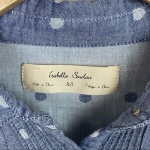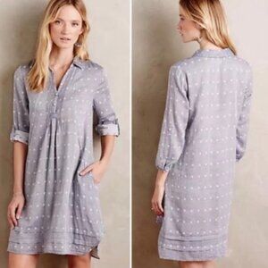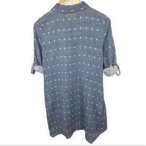 Anthropologie Isabella Sinclair Chambray Dress in Women's Size XS. 100% cotton. Polka dot print. Collared v-neckline with henley button down placket. Pockets. Roll tab sleeves. Viscose lining. Very good pre-loved condition. No visible flaws.