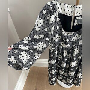 Charming and chic, this black and white Anthropologie Jane babydoll mini dress features a textured fabric with delicate embroidered floral detailing. Designed with a square neckline, puffed sleeves, and a flattering babydoll silhouette. Functional side slant pockets and a back zip with button closure complete the look.