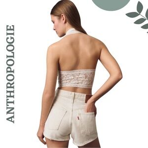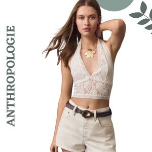 This ethereal white lace halter crop top from Anthropologie blends delicate femininity with modern edge. Designed with a deep V-neckline and sheer floral lace, it’s perfect for layering under a blazer, styling with high-waisted denim, or pairing with flowy skirts for a dreamy festival look.