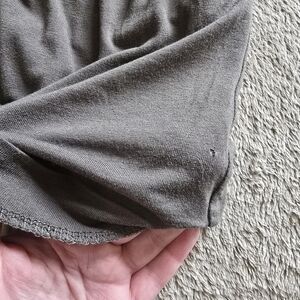 Olive green tank dress with cowl neck, short skirt with longer asymmetrical faux wrap over top knotted at the side. In good used condition, hem is loose in one spot with a small hole by the side seam. Hem could be shortened to hide the hole.