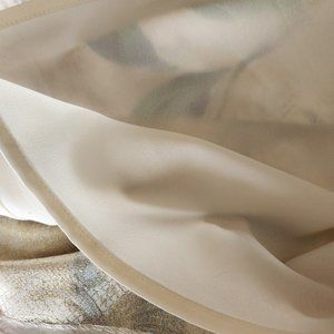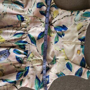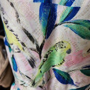 Gorgeous painterly bird design on metallic and lace material with inner lining. Peplum style with zip up the back. Very good condition with no stains or rips.