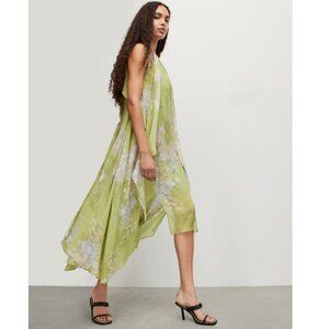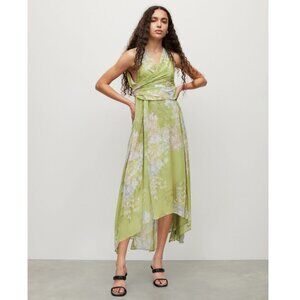 Flowy maxi dress with floral pattern. Light green fabric with elegant drape. Ideal for warm days.