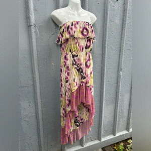 Flirty mesh chiffon high low strapless dress from Lilka Anthropologie. Ruffled detail at the top, high front, low back.