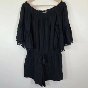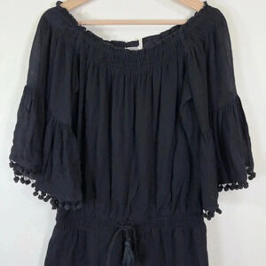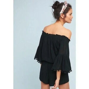 Anthropologie Lilka Pompom Sleeve Off Shoulder Black Boho Romper
