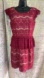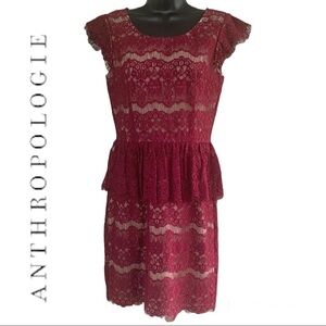 - Anthropologie, Maeve lace peplum pencil dress. Dark cranberry crochet lace with beige lining. Eyelash lace cap sleeves, front round neck and V back, layered ruffle peplum waist, fringe eyelash lace hem. Zips in back. Sheath silhouette.