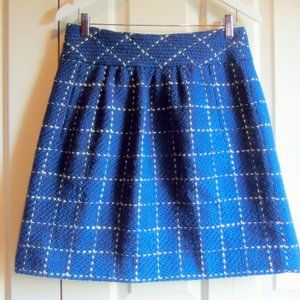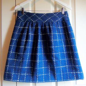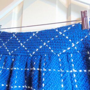 Bright royal blue covered with a large white grid pattern makes this wool skirt stand out from the crowd. The textured fabric is 70% wool and 30% acrylic. It is beautifully constructed with a comfortably wide waistband that is cut with the white grid pattern in the shape of diamonds, gathering and a zippered closure. As well, it is completely lined.