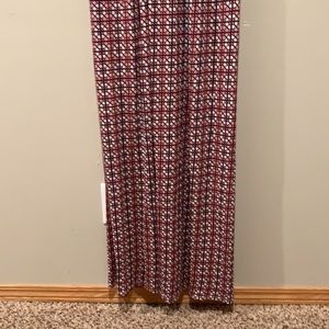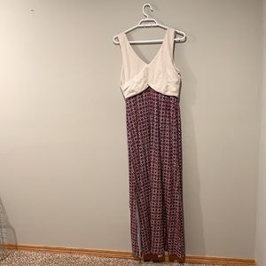 EUC Anthropologie Maeve “Elysian” cream, pink, indigo, and orange maxi dress with back slits in women’s size medium (M).