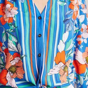 Anthropologie Maeve Floral Blouse Womens 12 Blue V-Neck Tie Front Long Sleeve