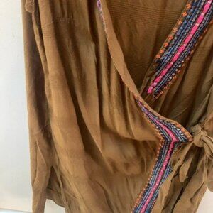 Additional Information: Viscose. V-neck. Embroidered detail. Wrapped tunic silhouette. Tie closure. Inside Button Closure. Machine Wash.