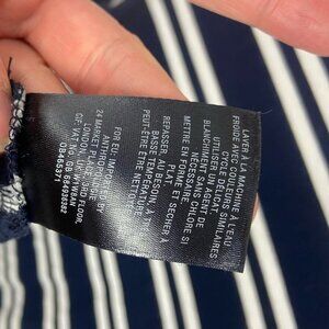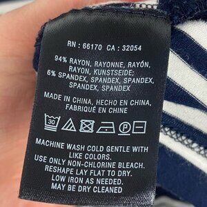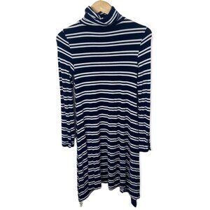 Anthropologie Maeve Navy Blue and White Striped Turtleneck Dress with Asymmetric Hem and Women's Size XS. Long sleeves. Knee length. Turtleneck style. Lots of stretch. Button details on the sleeves. 94% rayon and 6% spandex. Machine washable. Very good pre-loved condition. Minor wear but no visible flaws.